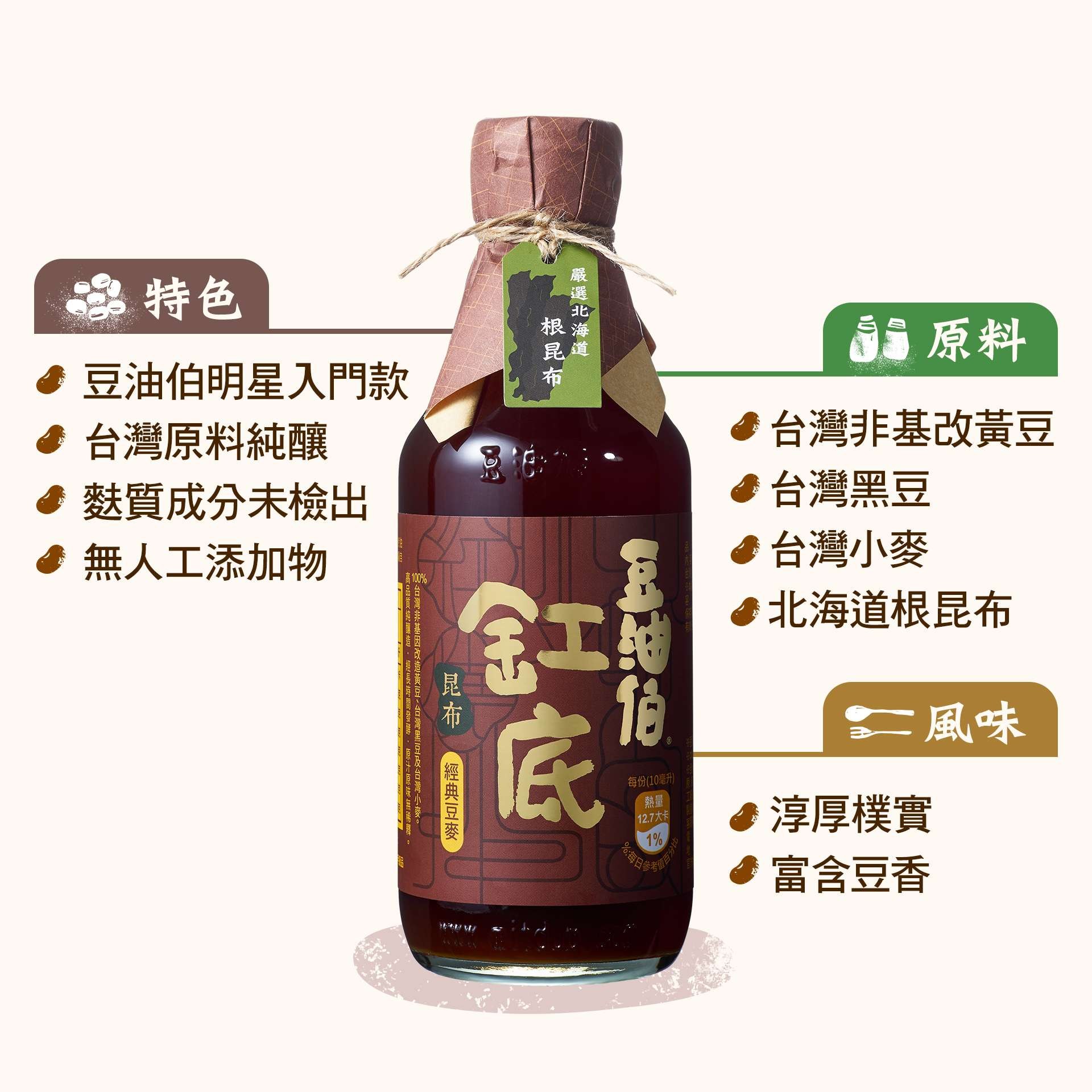 豆油伯昆布缸底釀造醬油:選用台灣非基因改造黃豆、黑豆和小麥純釀造,醬汁不稀釋,風味淳厚樸實,富含豆香,加入嚴選來自北海道的根昆布,風味淡雅,海洋般的自然鮮味與缸底醬油的絕妙搭配,精醇滋味令人難以忘懷。