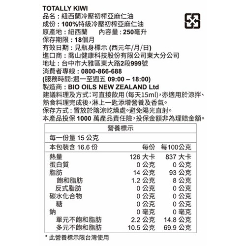 點我下載紐西蘭 Totally kiwi 100%冷壓初榨亞麻仁油 250mL