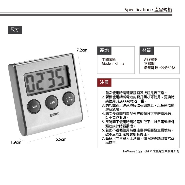 Tamsaa 廚房計時器 ABS材質 白色 最大計時99分59秒 1個