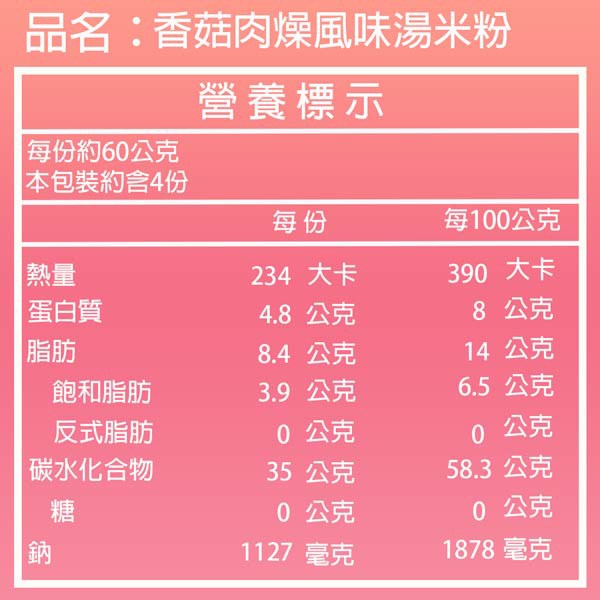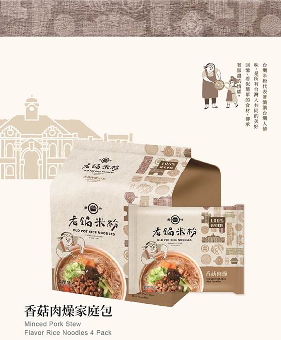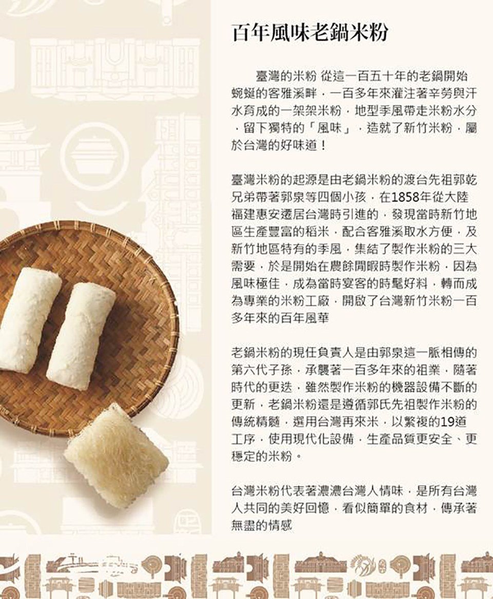 商品規格1.商品組合/規格:《老鍋米粉》家傳好味道家庭包系列(4包/袋)2.商品品名:《老鍋米粉》家傳好味道家庭包系列(4包/袋)3.商品重(容)量:詳見內文4.內容物成分(如含有豬、牛成分請加註國別):詳見內文5.食品添加物名稱:詳見內文6.原產地(國):台灣7.製造廠商或國內負責廠商名稱:家庭雲端股份有限公司8.製造廠商或國內負責廠商地址:台北市大安區忠孝東路四段218號13樓9.製造廠商或國內負責廠商電話:02-8771022210.以消費者收受日算起,至少距有效日期前?日以上:保期: 9個月11.食品業者登錄字號:A-124549062-00000-012.投保產品責任險字號:國泰1516字第11PD03658號備註欄:無