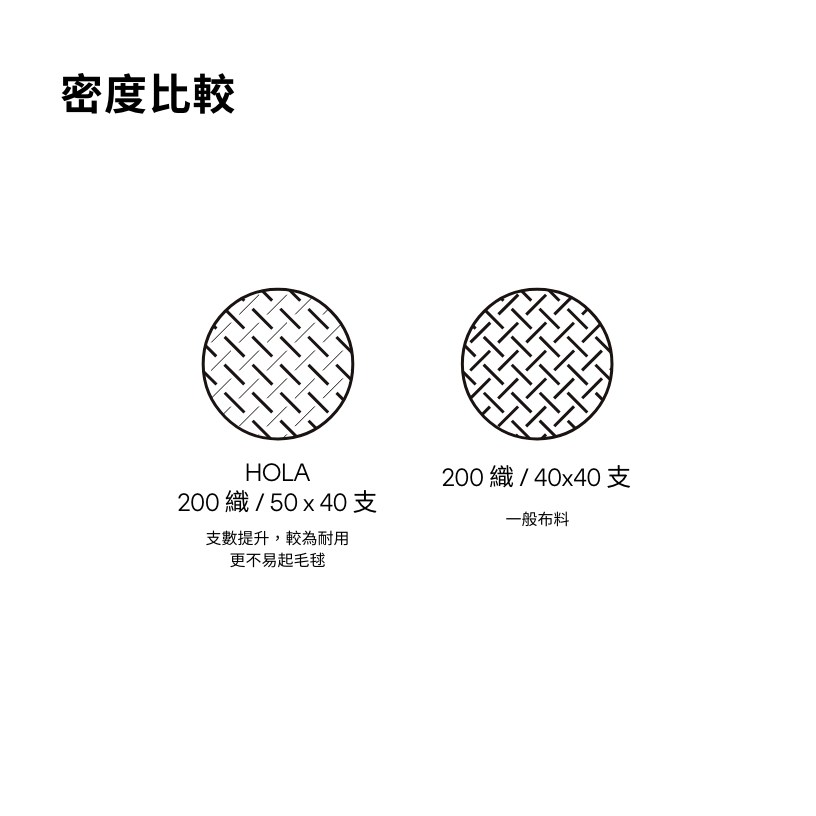 織品布料的支紗數越高、紗線越細,觸感會更加細緻柔順;紗織數(TC)代表編織的密度,織數越高,布料越緊密強韌。