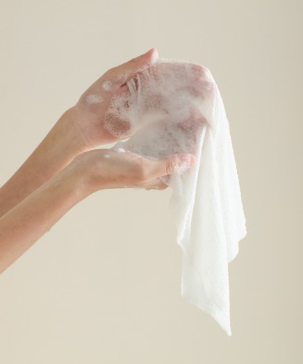 將洗臉巾沾濕洗淨肌膚