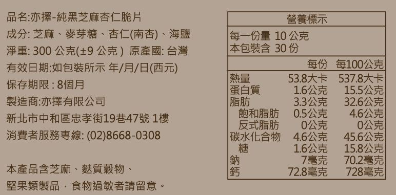 亦擇純黑芝麻杏仁脆片250g