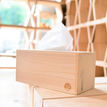 使用 0.3cm 日檜厚單打造,天然的木紋及年輪就是「無垢設計」的展現,有檜木香的抽取體驗,適用於市售軟包裝抽取面紙。