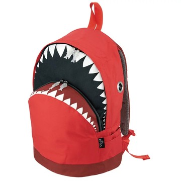 鯊魚背包以鯊魚頭部作特寫,參考傳統背包之結構,左右裝上金屬圈作眼睛,袋身絲印上兩排白色尖牙,兩側各車摺了幾疊作魚鰓,簡單便將鯊魚的威猛表現出來。加上特製的魚型拉牌,提醒你鯊魚絕大多數時候只吃魚不咬人,糾正鯊魚給人之負面形象。袋身上車縫了紅旗和藍白鯊魚旗,是當海灘外有鯊魚出現時所懸掛的旗幟,讓鯊魚包增添點小趣味!