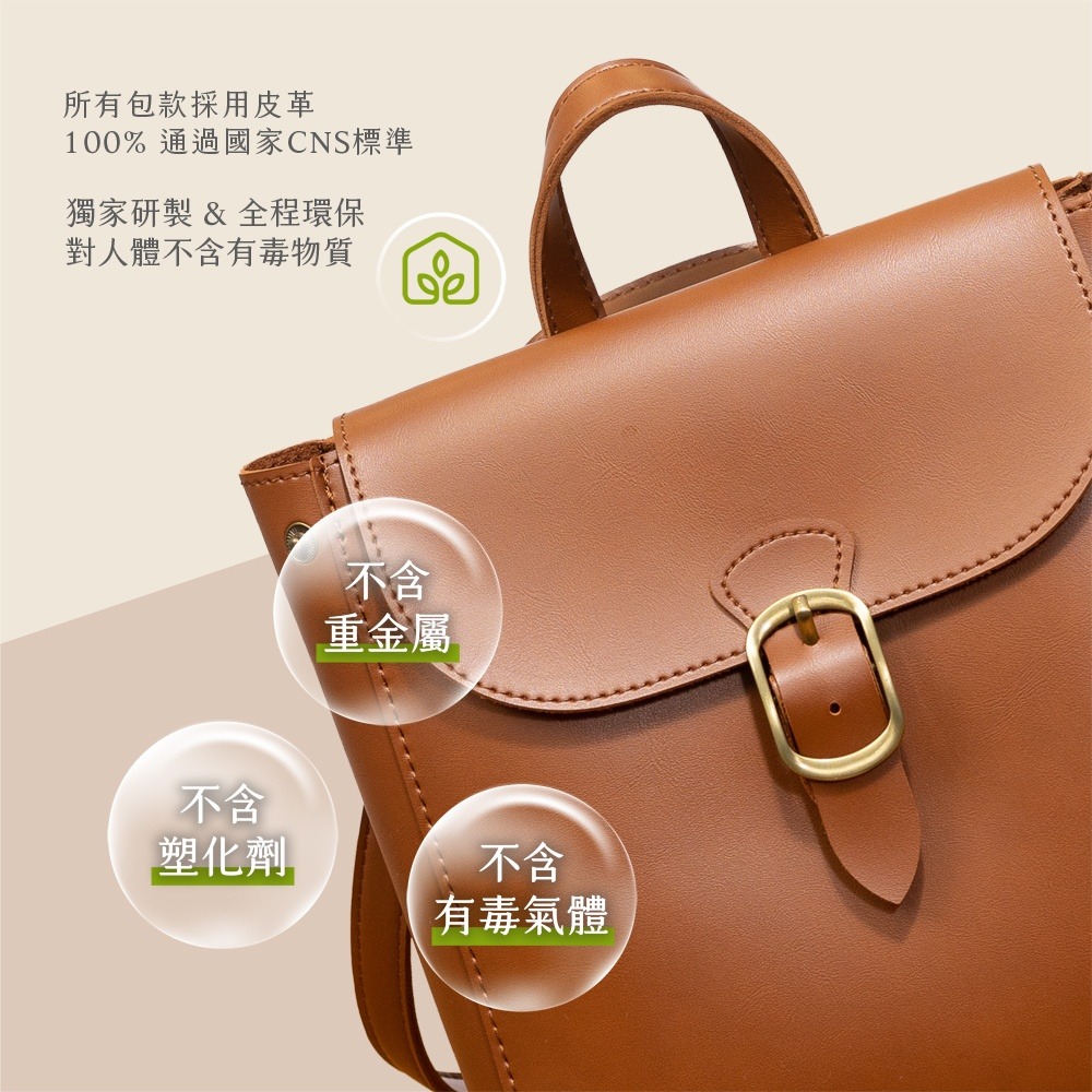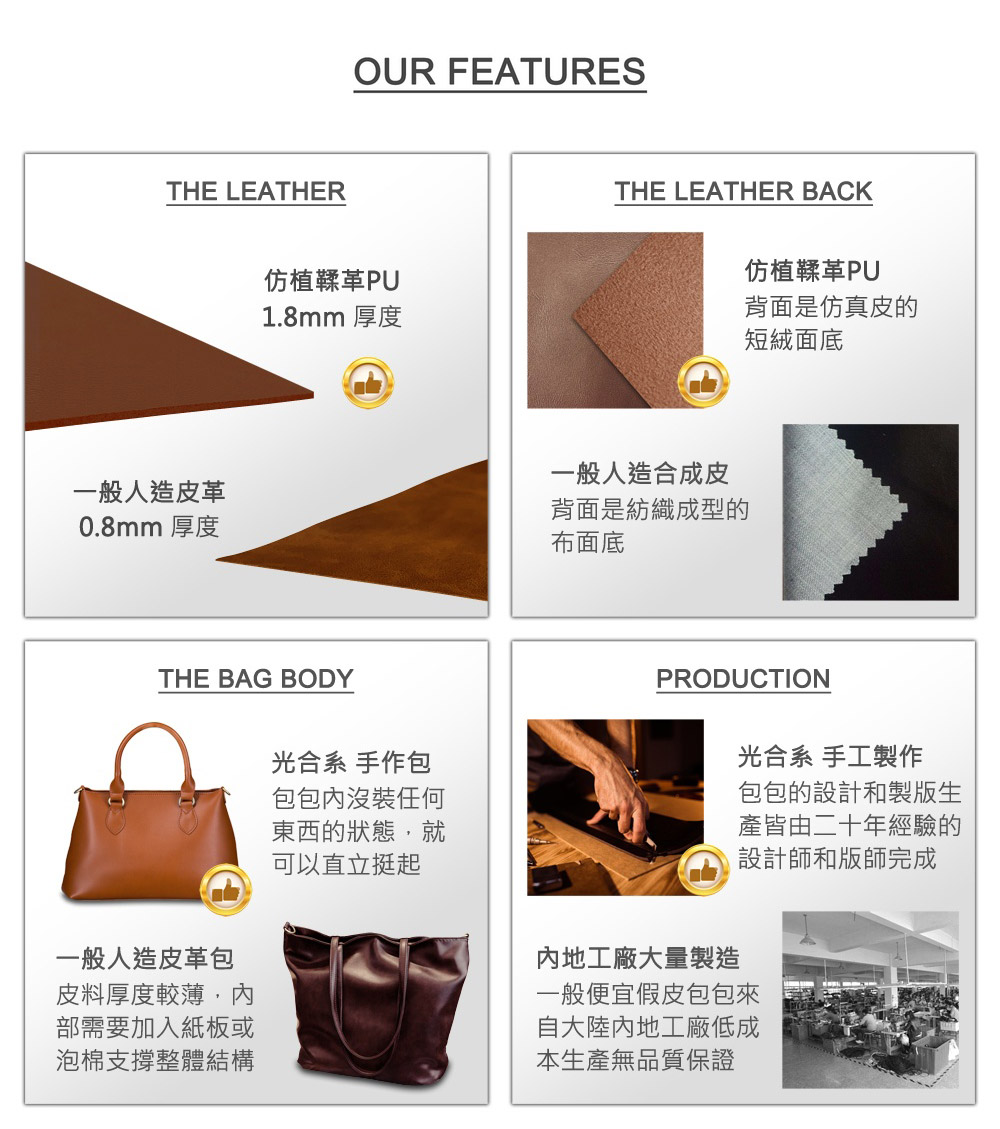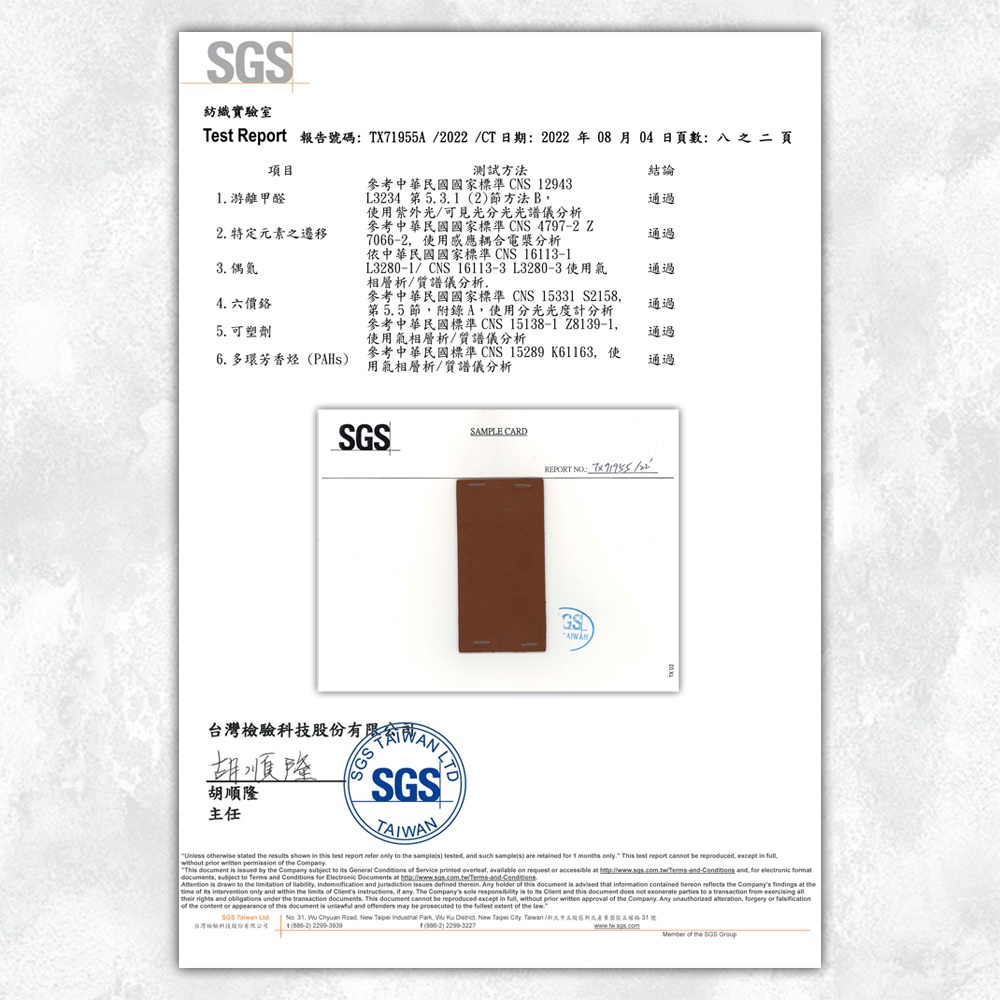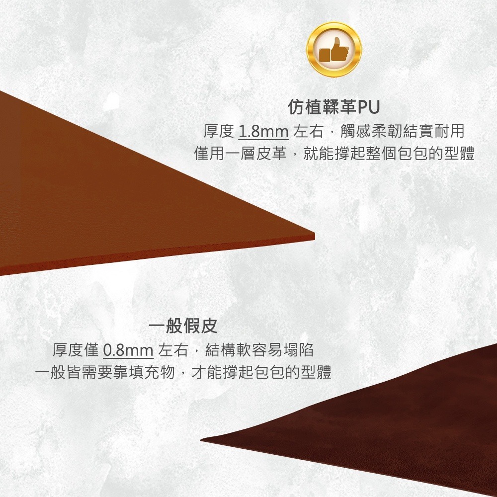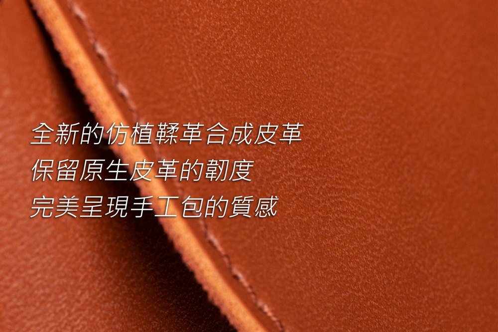 通過CNS國家環保標準,皮革厚度相當於一般PU兩倍的厚度。表面植鞣革手感,防潑水,質地柔韌且耐用,沒有一般假皮會產生的刺鼻塑膠味道。