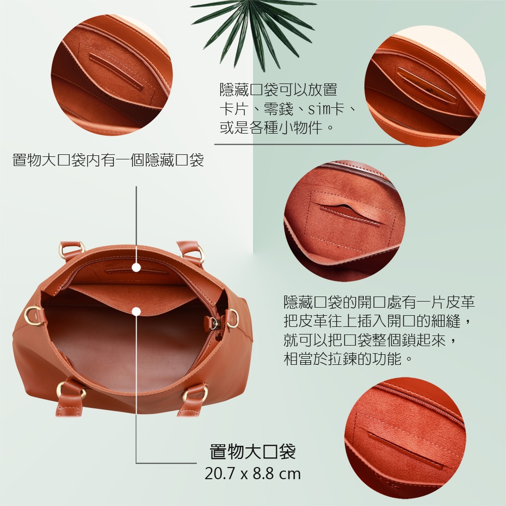 大口袋內還有一個隱藏式小口袋 (9.5 x 4.8 cm),可放信用卡/錢幣/sim卡...等小物。袋口的皮牌可以反插鎖住袋口,代替拉鍊的功能。