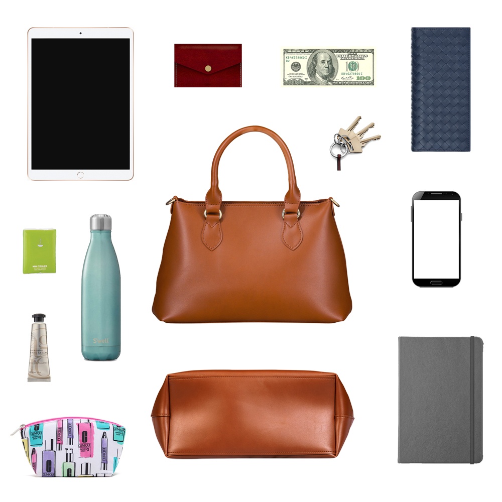 可容納 iPad 正常尺寸(稍緊)、礦泉水瓶、以及一般女用長夾。