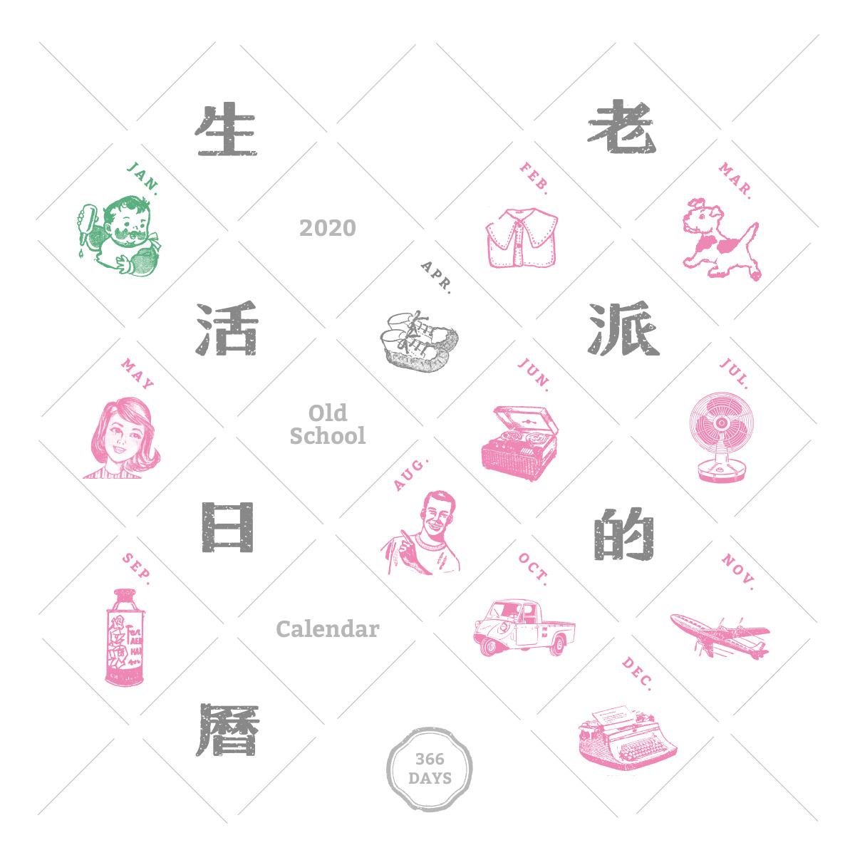 《2020老派的生活日曆》以「怦然初心」為核心精神,集結1951-1970年間,近20年的台灣老報廣告插畫素材,一年12個月設定不同主題,每月圖像與當月主題相呼應,設計頁頁不同。