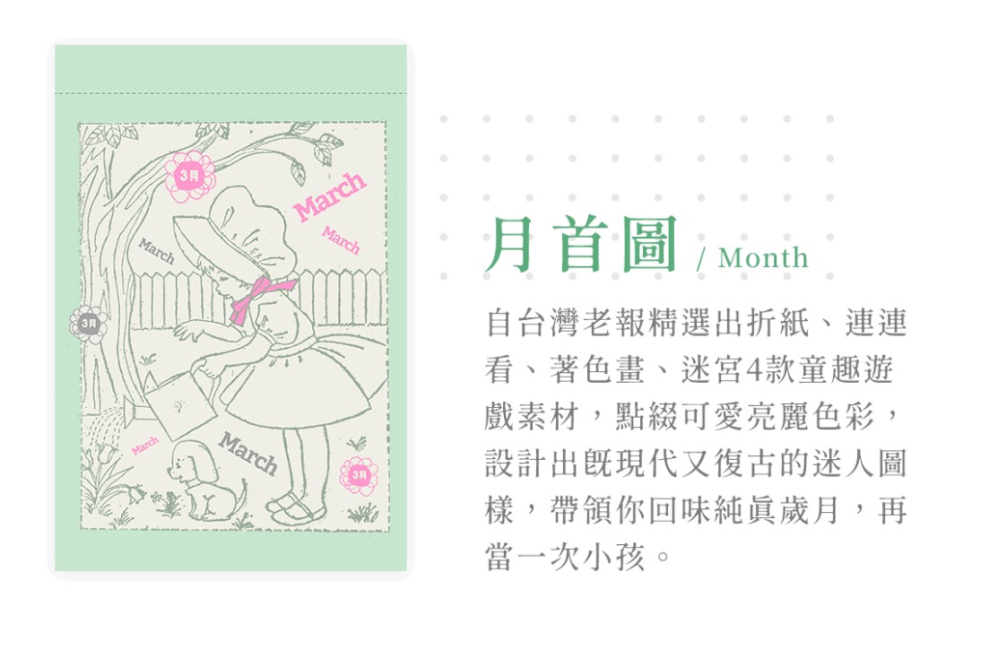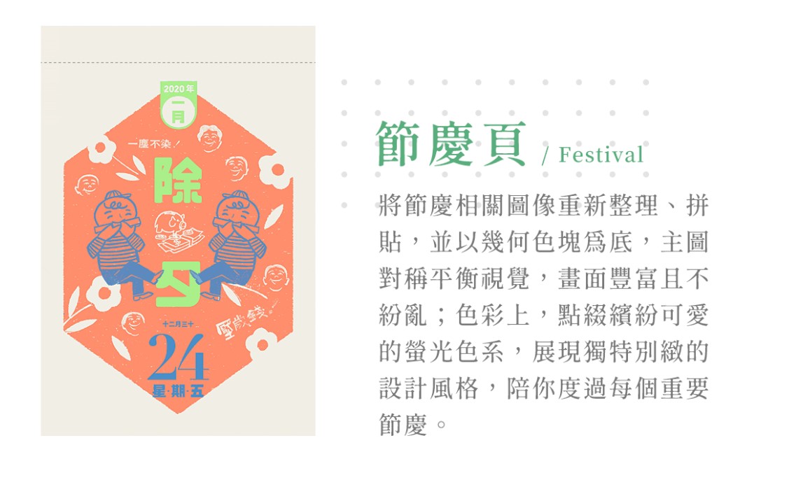 這次頁面設計不僅保存了舊時代的復古圖像,更將"童趣"元素融合,將頁面分成四個架構:月首圖、平日頁、週末頁、節慶頁。