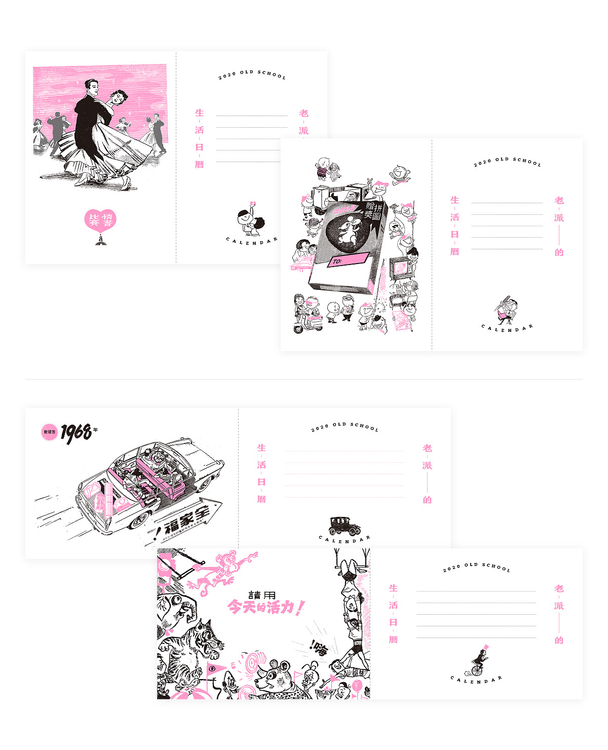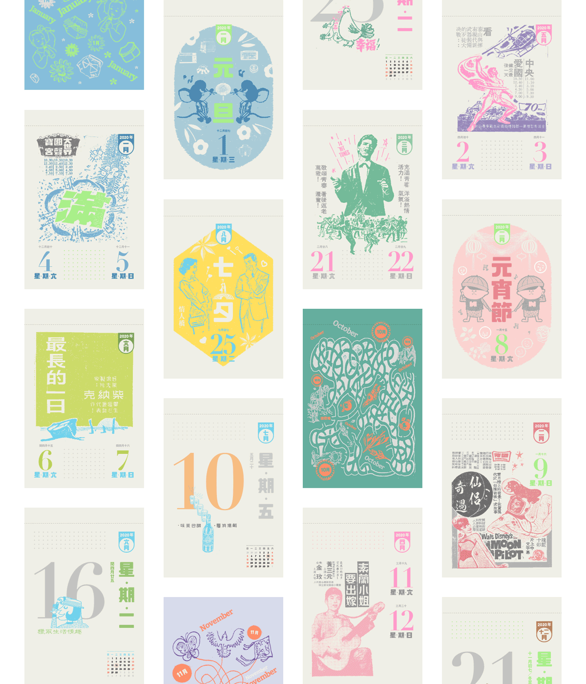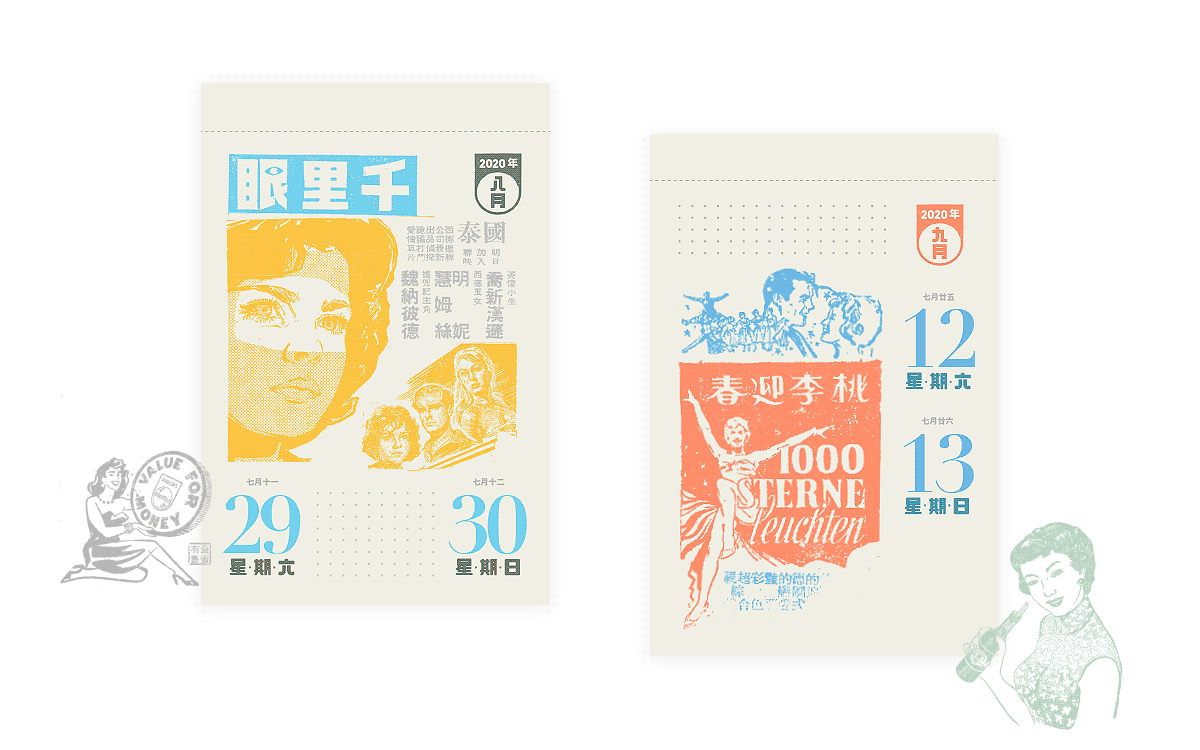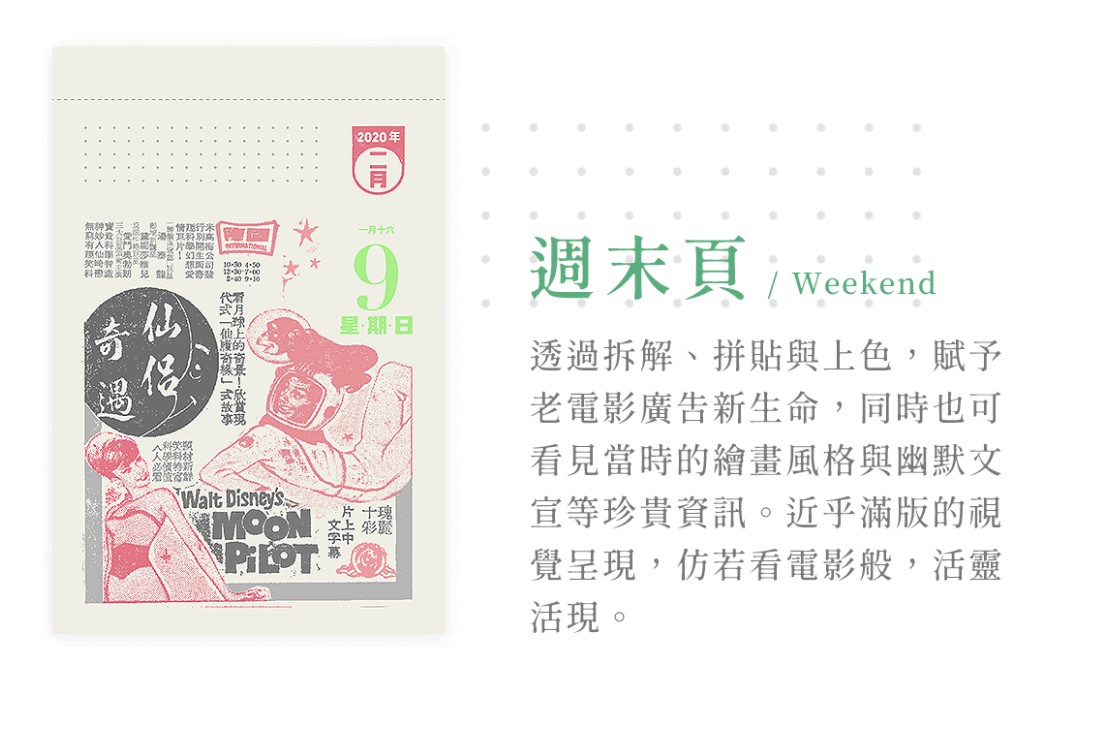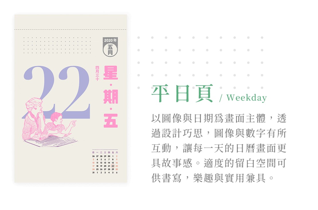 2020年的日曆在結構與功能性,皆做了相當程度的調整與改善;在視覺設計上,加入童趣設計元素,與老報廣告巧妙融合,期盼在新的一年,能帶給大家更豐富美好的日曆體驗。
