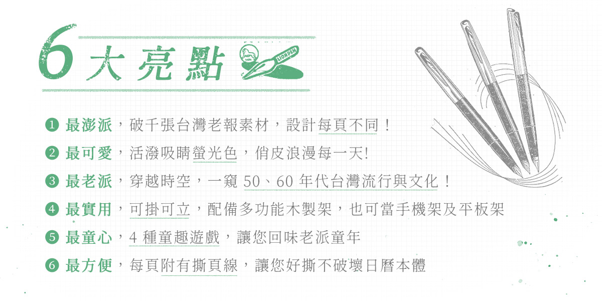 最澎派:全年頁頁不同,使用破千張老報素材,澎派豐富的圖像,展現我們的老派誠摯心意。