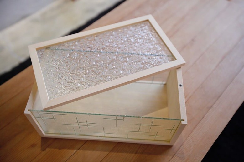 最特別的結合就是將木頭的工藝與玻璃的花窗圖騰融為一體。玻璃我們採用的是明順玻璃行壓花玻璃圓片來使用。這次商品我們嚴選日治時期台製的海棠花紋