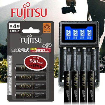 日本 Fujitsu 低自放電4號900mAh充電電池組(4號4入+四槽USB充電器+送電池盒)