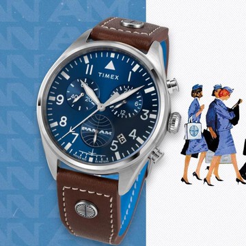 TIMEX 天美時 x Pan Am Day-Date 42毫米三眼計時手錶 (藍x棕 TXTWG030000)