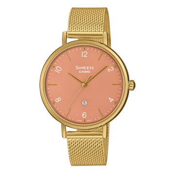 【CASIO 卡西歐】SHEEN 復古金x耀眼橘 藍寶石水晶玻璃 日期顯示窗 米蘭錶帶 SHE-4562GM-4A_34mm