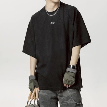 麂皮絨T恤男夏季美式復古五分袖上衣高街潮牌寬松休閑短袖體恤衫