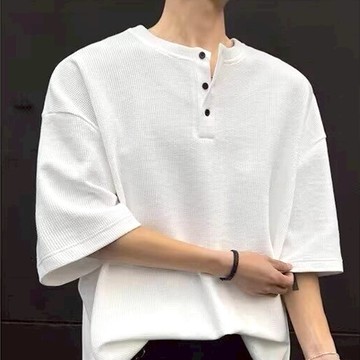 白色t恤男長袖春秋潮流簡約套頭打底衫開叉排扣上衣休閑寬松體恤