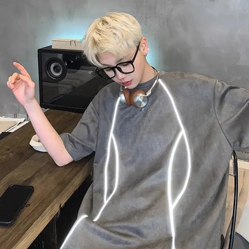 小領口t恤男日系復古cityboy落肩上衣夏季潮流簡約刺繡麂皮絨短袖
