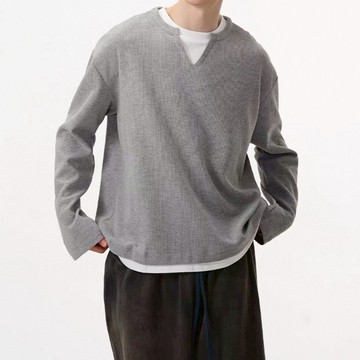 可樂生活自制 秋季慵懶風華夫格假兩件日系寬松長袖打底T恤男女