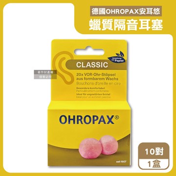德國OHROPAX安耳悠-Classic柔軟蠟質溫度塑型貼耳式隔音耳塞10對/黃盒(SNR 21dB降噪規格,CE歐盟認證,靜音舒適保護聽力,凡士林親膚耳塞)