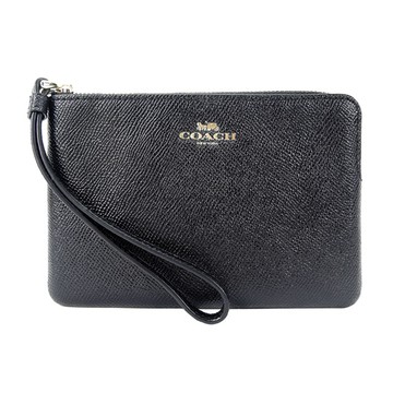 COACH象牙白點點印花黑色荔枝紋皮革L型拉鍊萬用手拿包