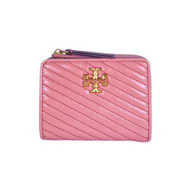 【Tory Burch】 Kira Moto縫線仿舊設計金屬LOGO暗釦拉鍊零錢袋短夾(粉色)