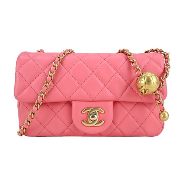 CHANEL 經典菱格紋小羊皮金球金釦鏈帶翻蓋斜背包(粉色)