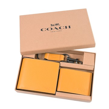 COACH 男款 荔枝紋短夾/證件夾/鑰匙圈禮盒組-琥珀黃