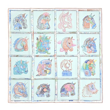 Hermes 愛馬仕 Chevaloscope 90 cm手工捲邊斜紋真絲方巾(水綠/珊瑚紅/藍)