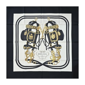 Hermes 愛馬仕 Brides de Gala 90 cm典藏手工捲邊斜紋真絲方巾(黑/奶油/金)