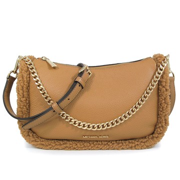 MICHAEL KORS CARMELA 金字LOGO鹿棕色鵝卵石紋皮革毛毛滾邊兩用包