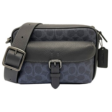 COACH丹寧藍C LOGO PVC拼接午夜藍荔枝紋皮革前釦袋中款斜背男包