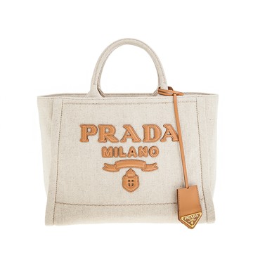PRADA 普拉達 新款立體皮革PRADA字體輕盈亞麻混紡手提袋/托特包 (米色)