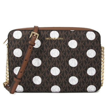 MICHAEL KORS JET SET ITEM 金字LOGO波點咖啡色滿版MK鏈帶斜背方包