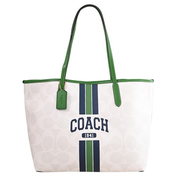 COACH CBI79 City 撞色條紋印花肩背托特包/購物包.白/綠邊