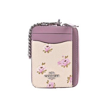 點我下載COACH 玫瑰印花白堊色C LOGO PVC莫蘭迪紫皮革鏈帶方型卡夾零錢包