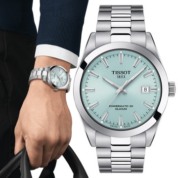 TISSOT 天梭 GENTLEMAN 冰藍 80小時矽游絲紳士機械手錶(T1274071135100)