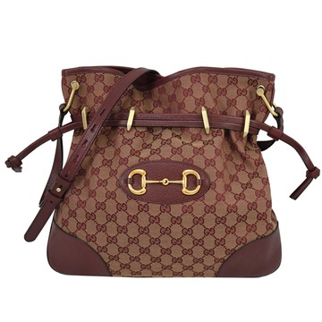 GUCCI 602089 1955 Horsebit 緹花帆布束口斜背包.酒紅
