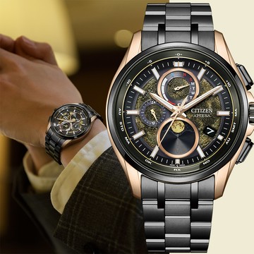 CITIZEN星辰 Gents AT9124-88E 台灣25週年限定款光動能電波對時時尚男錶 黑/玫瑰金 44mm