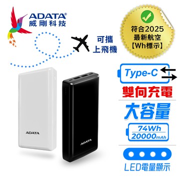 ADATA 威剛 C20 20000mAh 15W 3孔輸出 Type-C雙向快充 行動電源 (2色可選)