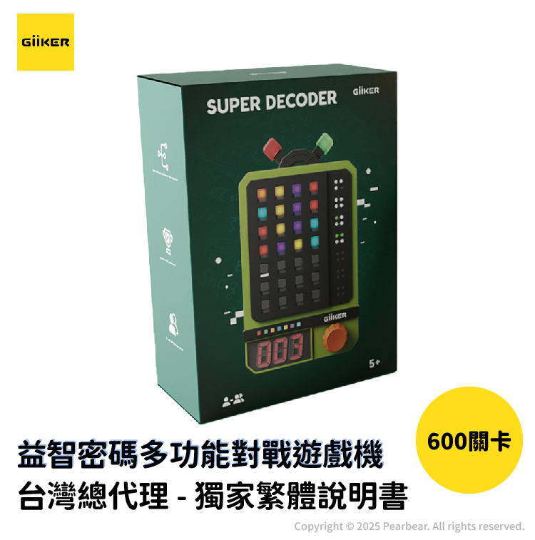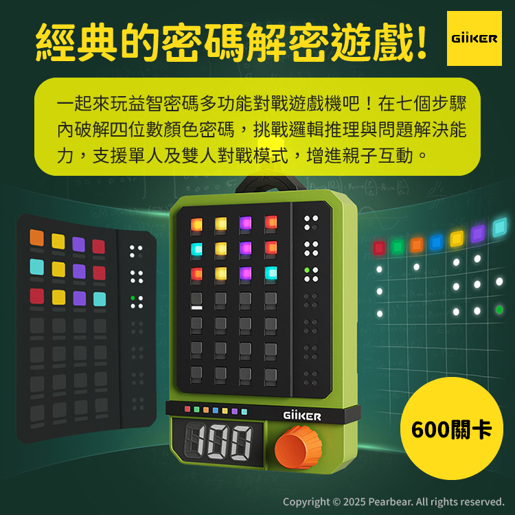 玩推理,學邏輯!以密碼破解為主題的益智密碼多功能遊戲機,玩家需在7個步驟內推理解碼隱藏的色彩密碼!內建雙重提示功能,初階畫線提示、高階圓點提示,並且支援單人闖關及雙人對戰模式。創意天線設計結合神秘音效,帶來沉浸式解密體驗。 循序漸進的提示方式,幫助孩子提升推理能力與自信心;親子互動模式更讓家庭時光充滿樂趣。小巧便攜,隨時隨地開啟腦力風暴,成為推理大師的隨身利器!