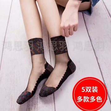 5雙夏季薄款透氣短襪襪子女棉底水晶絲中筒銀蔥金銀玻璃七彩絲襪