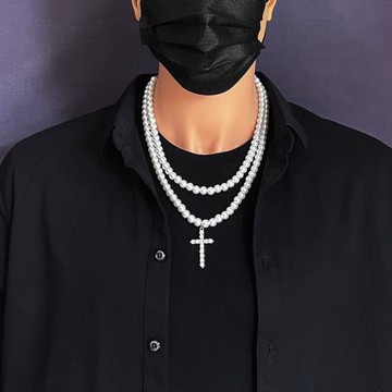 2023新項鏈潮流男女個性嘻哈雙層珍珠毛衣鏈十字架吊墜鎖骨鏈頸鏈