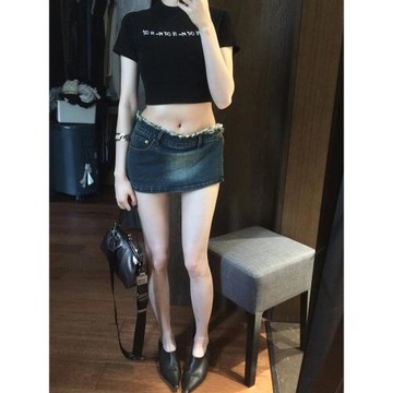 點我下載美式低腰毛邊牛仔超短裙女夏辣妹褲裙不規則性感重工小眾半身裙子