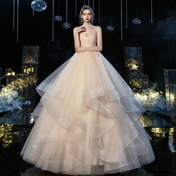 點我下載輕婚紗2025新款齊地氣質新娘森系超仙夢幻堆砌抹胸吊帶v領香檳色