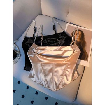 法式緞面魚骨抹胸吊帶背心女內搭外穿設計感水鉆鏈條性感辣妹上衣