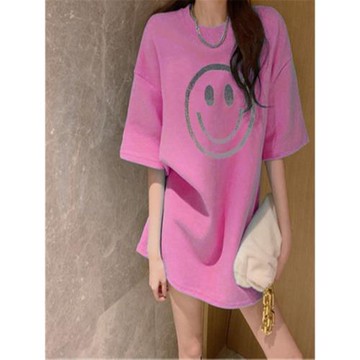 歐貨德絨秋冬季重工半袖大板燙鉆磨毛加厚中長款笑臉短袖T恤女士