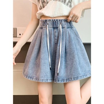 2025年新款大碼女裝松緊腰抽繩闊腿牛仔短褲女夏季高腰百褶裙褲子