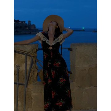 七月伊薩爾 意式女人復古碎花蕾絲連衣裙 深V漏胃小眾設計感裙子